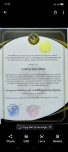 •دبلوم هندسة سلامة وصحة مهنية من أكاديمية نبض الأردن – نبوش الأمريكية.