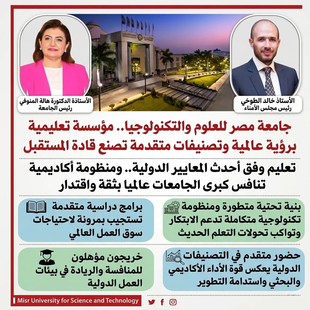 تواصل جامعة مصر للعلوم والتكنولوجيا ترسيخ مكانتها كأحد أبرز المؤسسات التعليمية في المنطقة، من خلال نموذج أكاديمي متطور يجمع بين جودة التعليم والابتكار والانفتاح الدولي. وبدعم مستمر من الأستاذ خالد الطوخي، رئيس مجلس الأمناء، نجحت الجامعة في التحول إلى منارة معرفية تعد قادة المستقبل وفق معايير عالمية.